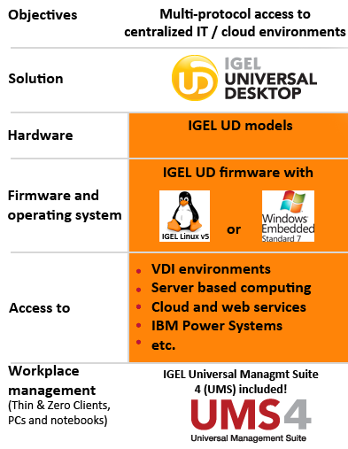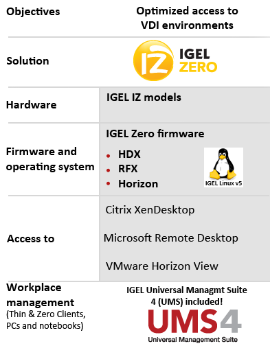- IGEL Universal Management Suite included with delivery Efficient, secure and site-independent remote administration of all devices, standardized management of PC and notebook platforms, and existing IGEL thin clients.