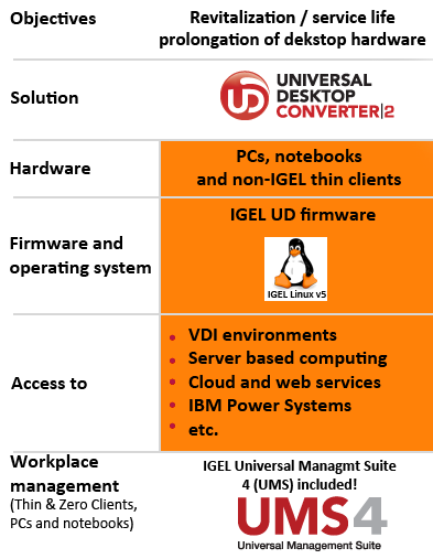 The Universal Desktop Converter 2 (UDC2) thin client software provides a highly effective alternative to traditional thin client hardware. The software is installed as the operating system on PCs, notebooks and selected thin clients, and turns the hardware into a powerful software-based and universally deployable thin client allowing secure access to almost all centralized IT infrastructures. Users havestable and reliable access to cloud computing services,server-based computing (SBC) applications and virtualized desktops (VDI). The local desktop operating systems are unified and standardized, and are centrally managed by IGEL’s user-friendly Universal Management Suite (UMS), the industry’s leading device management platform. The UDC2 software is available at a low, one-time cost.The UMS is included – free.Features